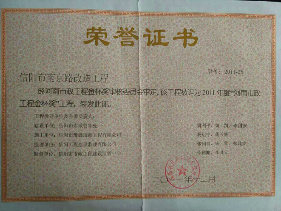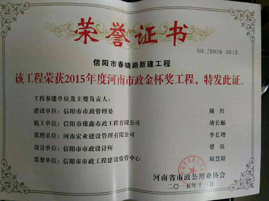 好風憑借力,送我上青云。近年來,公司積極參與城市市政基礎設施建設施工,積極參與市場競爭,先后承擔施工了市政府重點工程南京路道路改造工程、春曉路道路改造工程,東方紅大道道路改造工程、龍江東路新建工程等重點民生工程,其中南京路道路改造工程被省建設廳評為“中州杯”, 春曉路和東方紅大道道路改造工程被省建設廳評為“省優(yōu)工程”,成為城區(qū)一道道亮麗的風景線。參與施工了市典范小區(qū)“臺北城上城”、“恒大名都”以及師范學院、職業(yè)技術學院、交警支隊和軍區(qū)道路工程,參與施工了雞公山管理區(qū)、南灣管理區(qū)、明港鎮(zhèn)和羅山縣等部分道路小區(qū)工程施工,累計大小各類施工工程三百余項,企業(yè)影響力不斷擴大、輻射力不斷增強,市場份額不斷提高,企業(yè)信譽不斷彰顯,為信陽城市建設做出了積極貢獻,為企業(yè)的可持續(xù)發(fā)展插上了騰飛的翅膀。